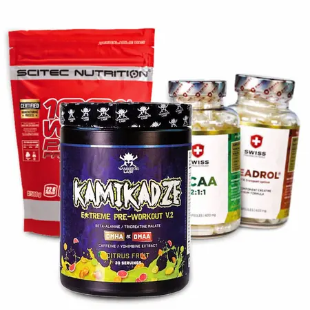 The Fitness Stack is designed to support athletes and fitness enthusiasts in achieving peak performance and optimal muscle recovery. Featuring a powerful blend of a Hardcore Pre-Workout Booster, premium Whey Protein, precise ratio BCAA 2:1:1 for optimal amino acid replenishment, and CREADROL as the safest form of creatine, this bundle offers a holistic approach to fitness supplementation. The carefully selected components work synergistically to ensure that your body receives the vital nutrients and support it needs during both workout and recovery phases.