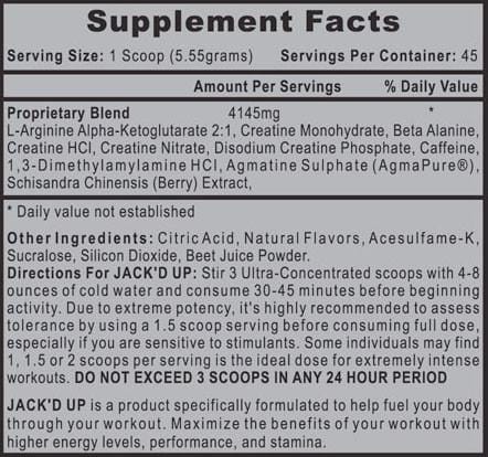The benefits from Jack’d Up DMAA are obvious: more power and endurance, elevated nitric oxide levels for extreme muscle pump and an incredible energy boost without crash. With this hardcore booster from the US you will reach the next level!